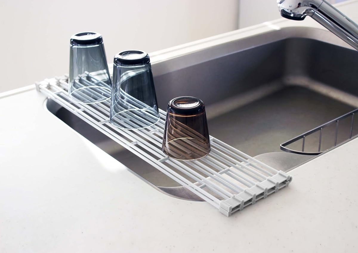 食器の水切りをしたい時には広げて乾かしています。網目が交互になっているので、食器を雪崩落ちることなく食い止めてくれるので便利です。使用しない際には丸めて隅においておくことができるので、シンクを広く使うことができます。