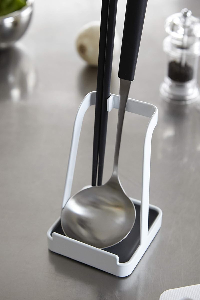 お玉と菜ばし、鍋ブタを同時に立てかけられる点です。これまでは調理の合間に鍋ブタを一時的に置いておく場所がなくコンロの壁際に置いたりしていましたが、これを購入して以来は決まった置き場が出来たことで作業性も上がりました。デザインも無駄がなくスッキリしていてコンパクト。しっかりしている点も気に入っています。安定性も良くて勝手に倒れてしまうこともなく、愛用しています。